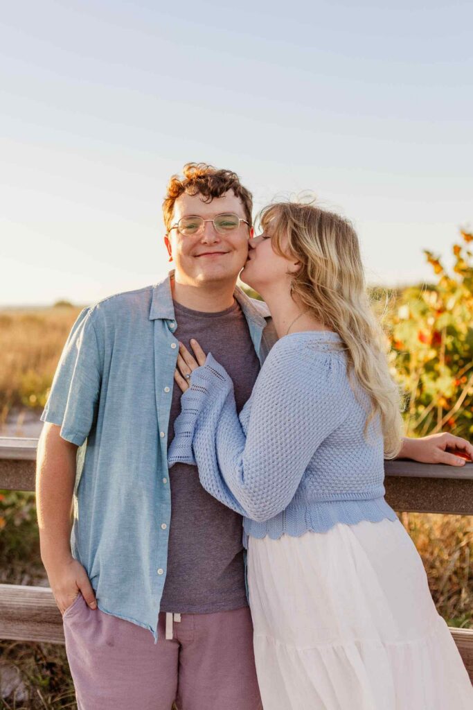 We started Savanna and Clay’s engagement session at Bowman’s Beach on the boardwalk. Savanna and Clay left their shoes at the end of the boardwalk, “it’s Sanibel” she said. Strangers are like family on Sanibel, no need to worry about your stuff here. As I was getting my settings ready to take the first photos, one of these strangers stopped to join a picture! Naturally, I took it, I’m not sure it’s the best photo but it’s a fun memory.